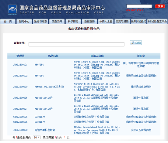 進(jìn)入欄目可以看到,已有8個(gè)受理號(hào)獲得默許,其中不僅包括來自默沙東研發(fā)(中國)有限公司和艾伯維醫(yī)藥貿(mào)易(上海)有限公司等跨國制藥企業(yè)的注冊申請,也有來自和鉑醫(yī)藥(廣州)有限公司、無錫智康弘仁新藥開發(fā)有限公司等國內(nèi)制藥企業(yè)的申請。