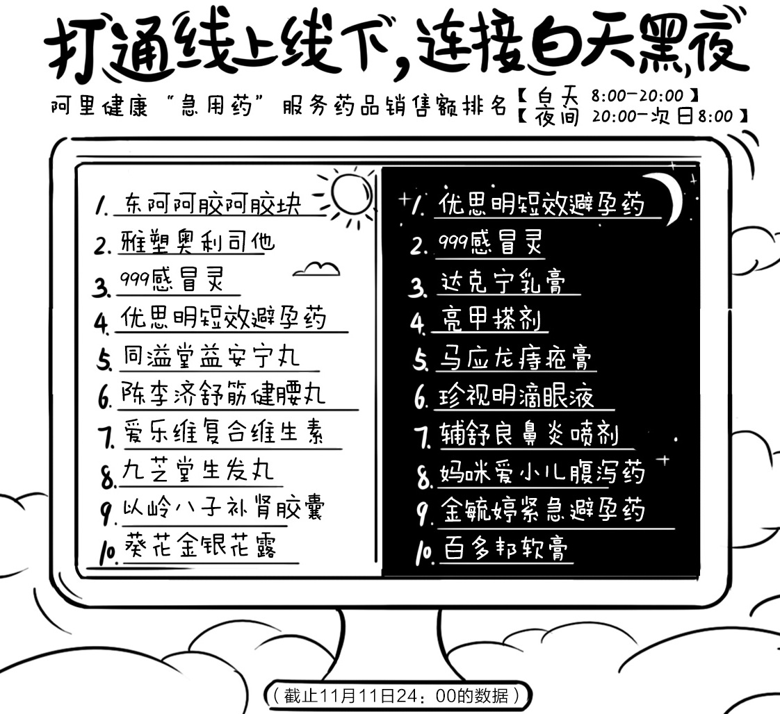 截止11日24點(diǎn),阿里健康“急用藥”藥品配送服務(wù)中,東阿阿膠阿膠塊、雅塑奧利司他、999感冒靈等排行白天銷售額前十。優(yōu)思明短效避孕藥、達(dá)克寧乳膏、媽咪愛(ài)小兒腹瀉藥等排名夜間銷售額前十。而從合作“新零售”藥房銷量排名來(lái)看,雙11當(dāng)天,漱玉平民大藥房、泉源堂大藥房、貴州一樹連鎖藥業(yè)等連鎖藥房躋身前十。