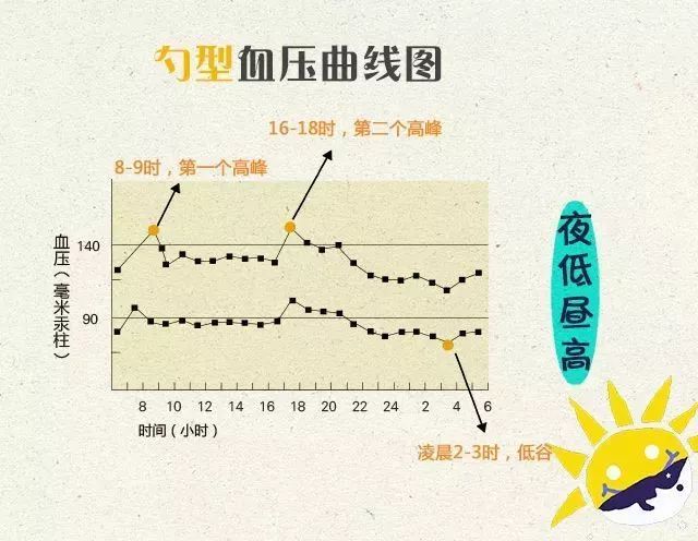 勺型血壓患者的血壓變化規(guī)律是正常的“晝高夜低,兩峰一谷”現(xiàn)象。