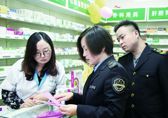 圖為執(zhí)法人員在一家藥店檢查索證索票情況。本報記者 王宣淞 攝