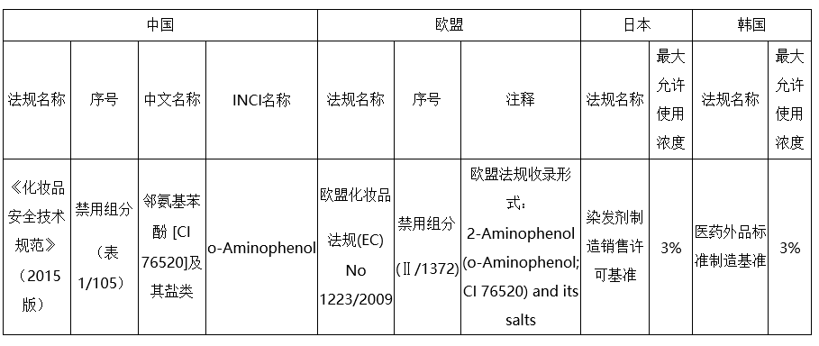 為保障化妝品使用安全,參考國際化妝品相關(guān)法規(guī),在《化妝品安全技術(shù)規(guī)范》(2015年版)修訂過程中,鄰氨基苯酚歸為禁用組分。