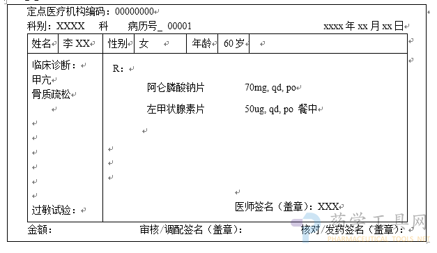 不規(guī)范處方:阿侖膦酸鈉、左甲狀腺素鈉未注明規(guī)格和數(shù)量。