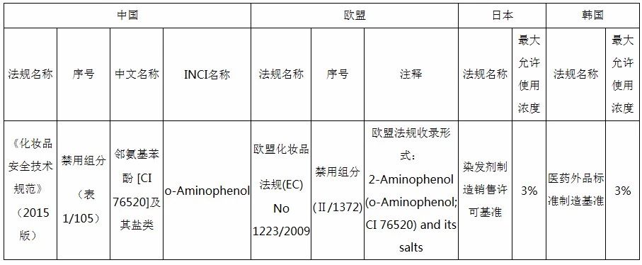 歐盟消費者安全科學委員會(SCCS)于2010年6月,曾發(fā)布該組分的評估報告:“因沒有足夠的安全性資料,不能給出鄰氨基苯酚的安全性結(jié)論?!睔W盟委員會在2013年4月修訂歐盟化妝品法規(guī)(EC) No 1223/2009時,將該組分列入化妝品禁用組分清單(附錄Ⅱ)。
