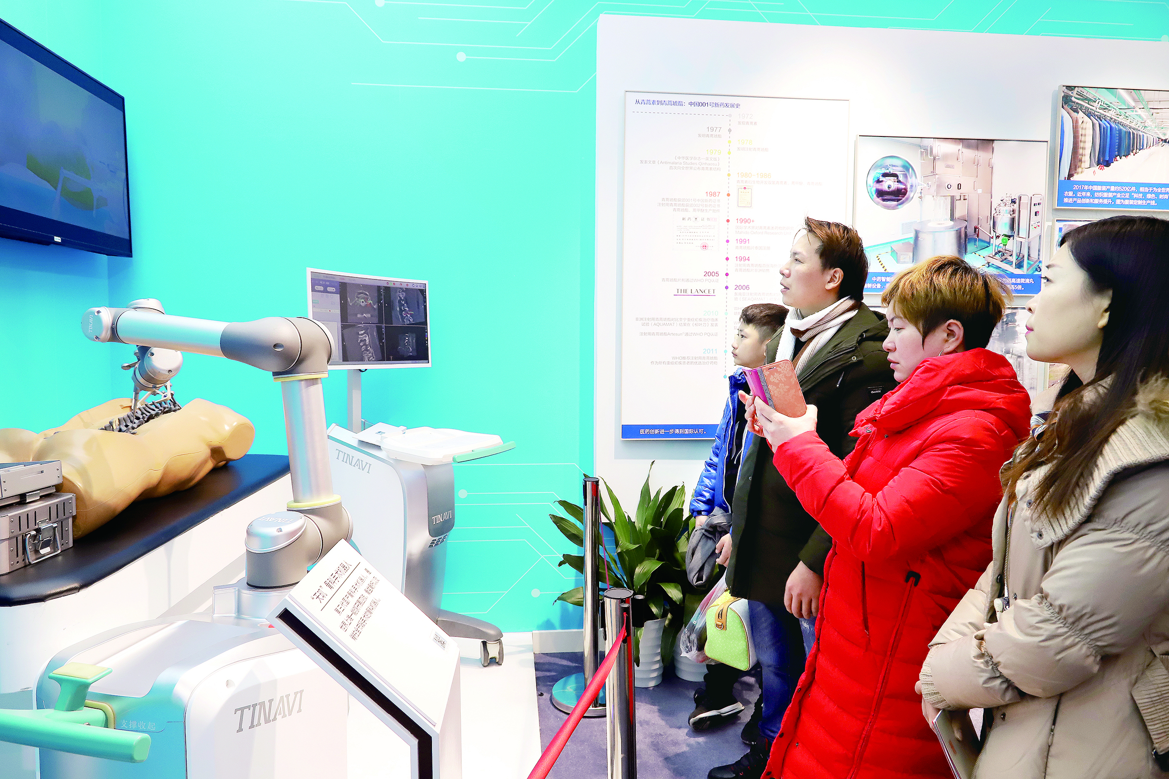 圖為12月27日,在展覽現(xiàn)場(chǎng),參觀者駐足觀看我國(guó)自主研發(fā)的世界首臺(tái)創(chuàng)傷及脊柱骨科手術(shù)機(jī)器人——“天璣”。