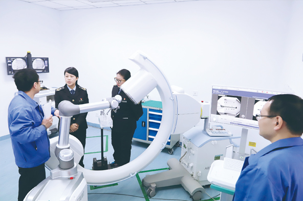 9∶10,高飛、謝立偉和東升鎮(zhèn)食藥監(jiān)所的馬佳怡等人匯合,來到第一家企業(yè)——北京天智航醫(yī)療科技股份有限公司檢查。這是生產(chǎn)我國自主研發(fā)的世界首臺(tái)創(chuàng)傷及脊柱骨科手術(shù)機(jī)器人“天璣”的企業(yè)。