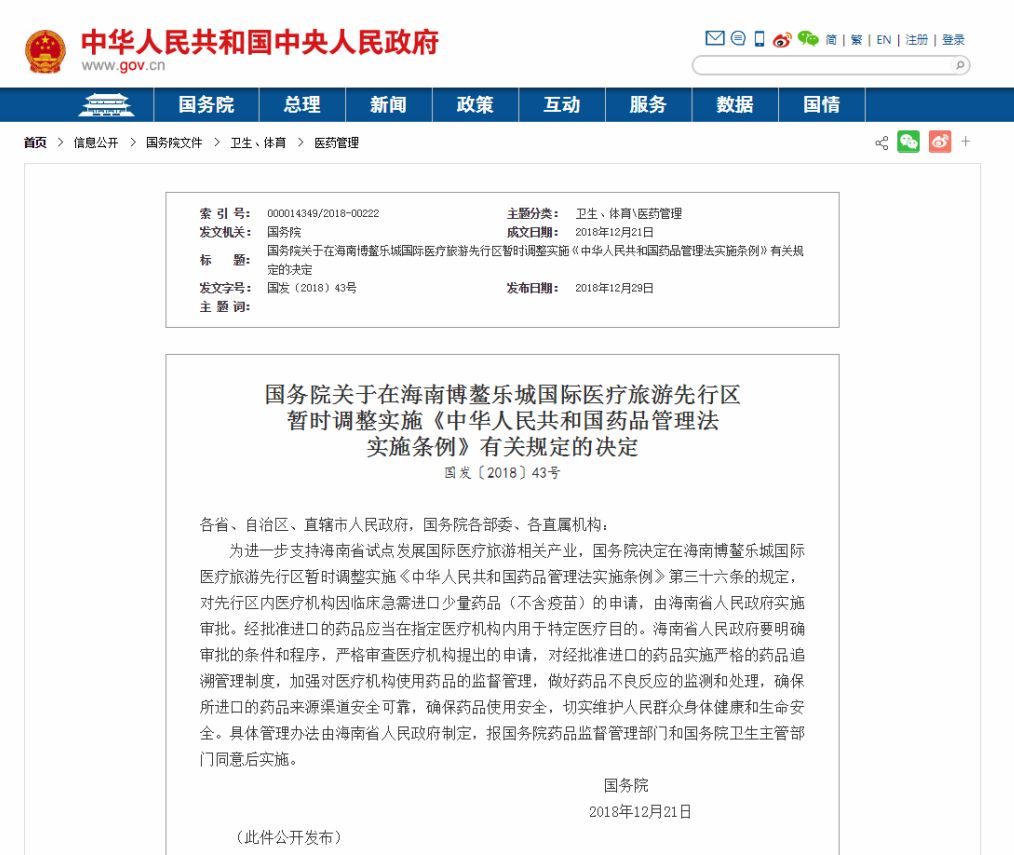 為進(jìn)一步支持海南省試點發(fā)展國際醫(yī)療旅游相關(guān)產(chǎn)業(yè),國務(wù)院決定在海南博鰲樂城國際醫(yī)療旅游先行區(qū)暫時調(diào)整實施《中華人民共和國藥品管理法實施條例》第三十六條的規(guī)定,對先行區(qū)內(nèi)醫(yī)療機(jī)構(gòu)因臨床急需進(jìn)口少量藥品(不含疫苗)的申請,由海南省人民政府實施審批。經(jīng)批準(zhǔn)進(jìn)口的藥品應(yīng)當(dāng)在指定醫(yī)療機(jī)構(gòu)內(nèi)用于特定醫(yī)療目的。海南省人民政府要明確審批的條件和程序,嚴(yán)格審查醫(yī)療機(jī)構(gòu)提出的申請,對經(jīng)批準(zhǔn)進(jìn)口的藥品實施嚴(yán)格的藥品追溯管理制度,加強(qiáng)對醫(yī)療機(jī)構(gòu)使用藥品的監(jiān)督管理,做好藥品不良反應(yīng)的監(jiān)測和處理,確保所進(jìn)口的藥品來源渠道安全可靠,確保藥品使用安全,切實維護(hù)人民群眾身體健康和生命安全。具體管理辦法由海南省人民政府制定,報國務(wù)院藥品監(jiān)督管理部門和國務(wù)院衛(wèi)生主管部門同意后實施。