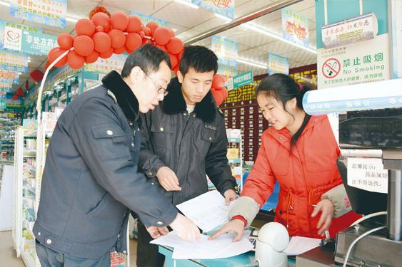 圖為執(zhí)法人員在灘歌鎮(zhèn)一家藥店檢查。張瑜 攝