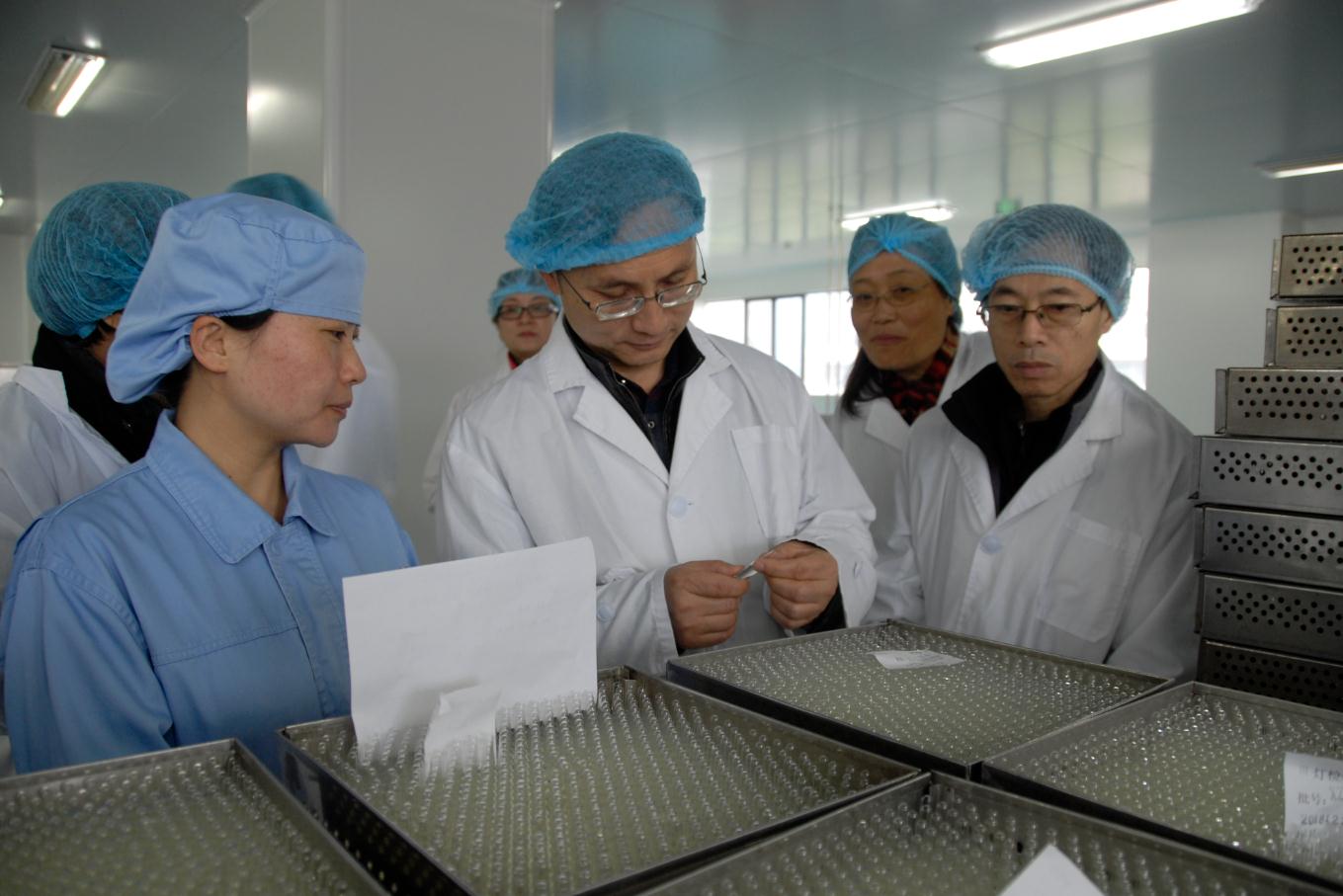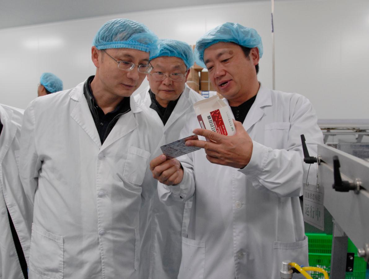 圖為劉本軍(右二)在口服車間藥品生產(chǎn)工藝。