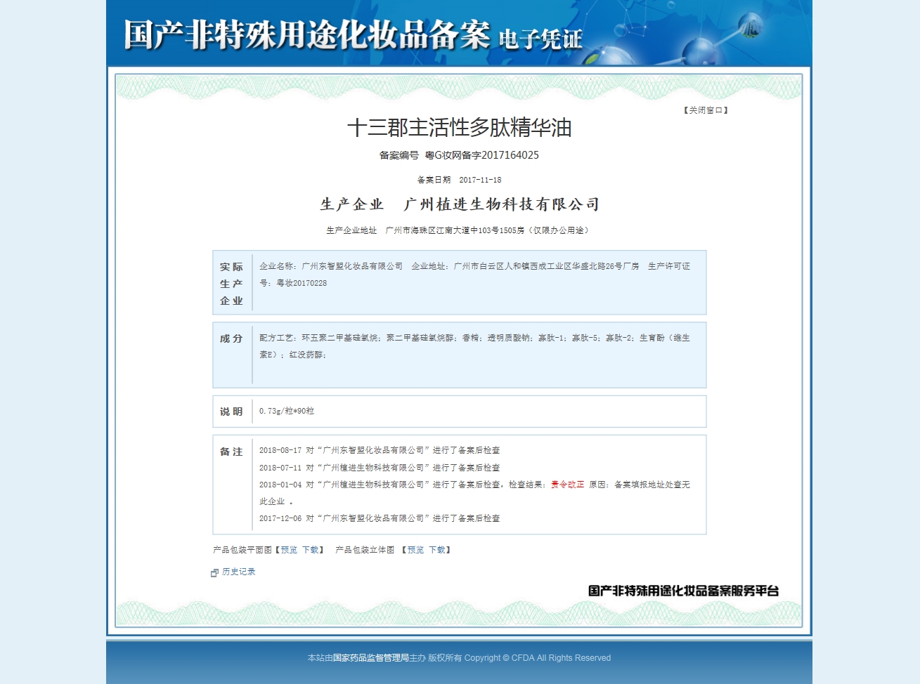 圖為十三郡主活性多肽精華油的備案信息