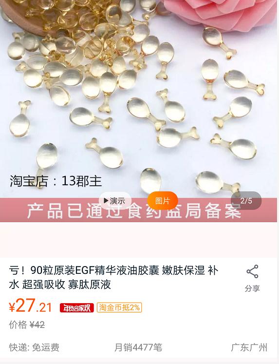 更有甚者,有些化妝品打著“EGF”的旗號(hào)宣傳,實(shí)際成分里卻沒有它。比如,五皇冠淘寶店鋪“13郡主”銷量最高的一款EGF精華液油膠囊,產(chǎn)品成分顯示主要從羊奶和一些動(dòng)物蛋白質(zhì)中提取有效成分,并且特別標(biāo)注該產(chǎn)品已通過藥品監(jiān)管部門備案。記者在國家藥監(jiān)局官網(wǎng)查詢國產(chǎn)非特殊用途化妝品備案信息發(fā)現(xiàn),該產(chǎn)品名稱為十三郡主活性多肽精華油,在其成分表中見不到EGF,只是含有寡肽-1、寡肽-2等成分。像這種化妝品商給寡肽-1產(chǎn)品貼上“EGF”標(biāo)簽來宣稱功效的現(xiàn)象在淘寶上頗為常見。(部分天貓?jiān)谑圻`法宣傳產(chǎn)品匯總見文末附圖)