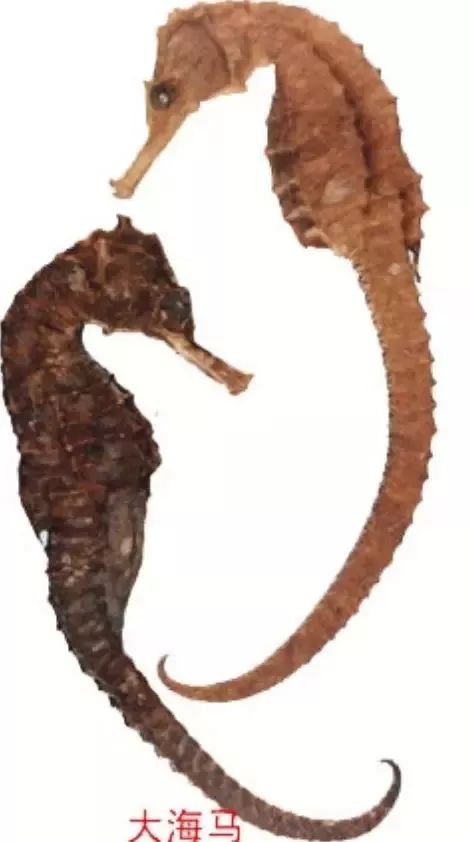線紋海馬:呈扁長形而彎曲,體長約30cm。表面黃白色。頭略似馬頭,有冠狀突起,具管狀長吻,口小,無牙,兩眼深陷。軀干部七棱形,尾部四棱形,漸細卷曲,體上有瓦楞形的節(jié)紋并具短棘。體輕,骨質(zhì),堅硬。氣微腥,味微咸。
