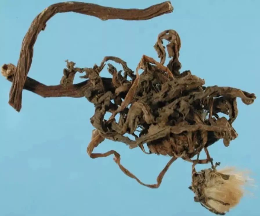 性狀鑒別:本品呈皺縮卷曲的團(tuán)塊。根呈圓錐狀,多彎曲,長(zhǎng)3~7cm;表面棕褐色,抽皺;根頭部有棕褐色或黃白色的茸毛,有的已脫落。葉基生,多皺縮破碎,完整葉片呈倒披針形,綠褐色或暗灰綠色,先端尖或鈍,邊緣淺裂或羽狀分裂,基部漸狹,下延呈柄狀,下表面主脈明顯。花莖1至數(shù)條,每條頂生頭狀花序,總苞片多層,內(nèi)面一層較長(zhǎng),花冠黃褐色或淡黃白色。有的可見(jiàn)多數(shù)具白色冠毛的長(zhǎng)橢圓形瘦果。氣微,味微苦。