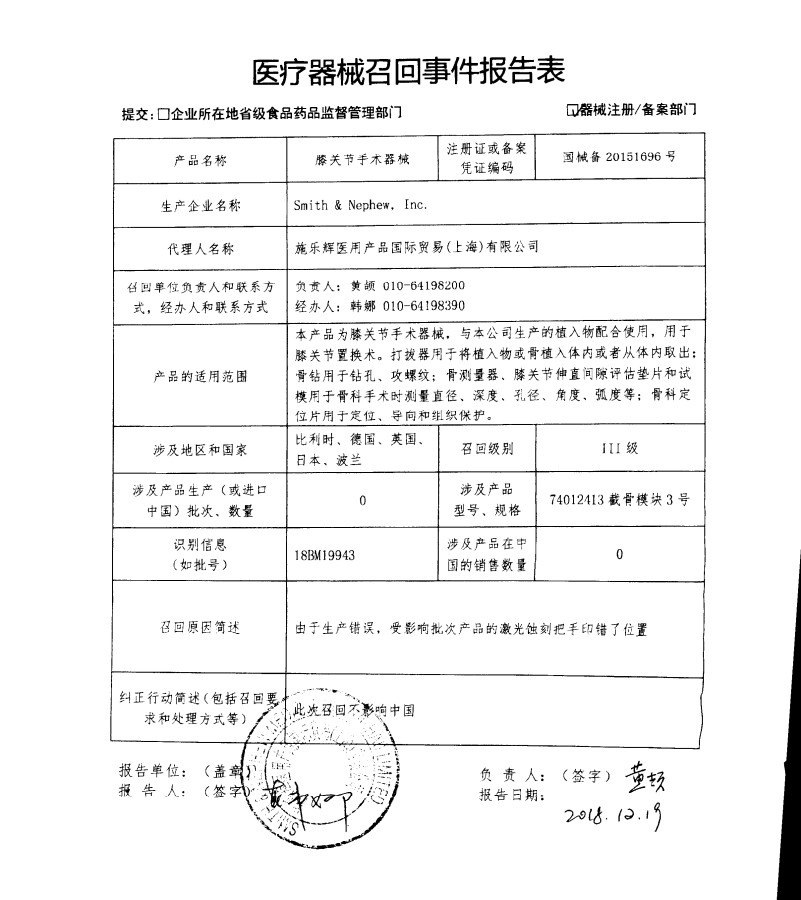 施樂輝醫(yī)用產(chǎn)品國際貿(mào)易(上海)有限公司報告,由于涉及產(chǎn)品生產(chǎn)錯誤,激光蝕刻把手印錯位置,生產(chǎn)商Smith & Nephew, Inc.對膝關(guān)節(jié)手術(shù)器械(備案憑證編碼:國械備20151696號)主動召回。召回級別為三級。涉及產(chǎn)品的型號、規(guī)格及批次等詳細(xì)信息見《醫(yī)療器械召回事件報告表》。