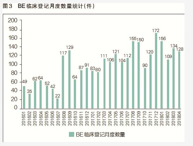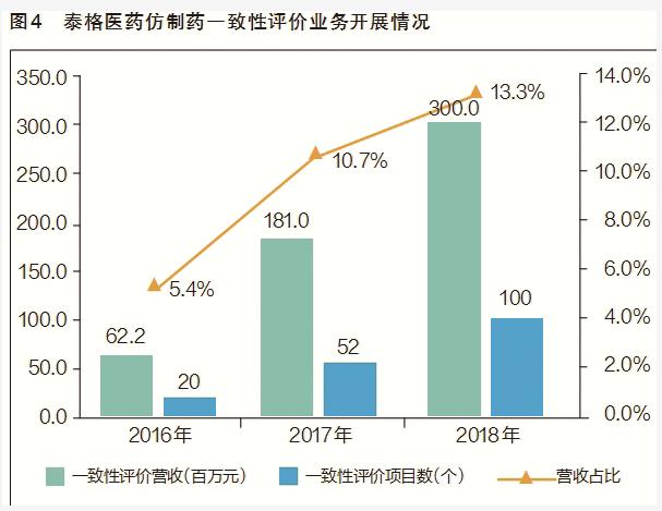 藥智網(wǎng)統(tǒng)計數(shù)據(jù)顯示,BE臨床新登記月度數(shù)量從2016年8月開始大幅增加,到2018年4月一直保持著較高的數(shù)量,這從側面反映出一致性評價工作正在加速(見圖3)。仿制藥一致性評價為CRO行業(yè)帶來了明顯的業(yè)務增量,以泰格醫(yī)藥為例,2016年,該公司仿制藥一致性評價收入約為6220萬元,僅占其營收總額的5%左右;2017年,來自仿制藥一致性評價的業(yè)務收入大幅提升到1.81億元,同比大增190%,營收占比提升到10.7%;2018年全年,預計該公司完成了約100個一致性評價項目,營業(yè)收入有望超過3億元(見圖4)。