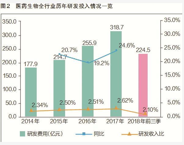 近年來,我國生物醫(yī)藥行業(yè)上市公司研發(fā)投入持續(xù)加大,不論是絕對數(shù)還是研發(fā)收入占比,都呈現(xiàn)出上漲趨勢。2015年,行業(yè)整體研發(fā)投入突破200億元大關,達到214.7億元,同比增長20.7%,研發(fā)收入比為2.5%;2016~2017年,研發(fā)投入年增速高于營收增速,2017年研發(fā)投入突破300億元,研發(fā)收入比上升到2.62%;2018年前三季度,全行業(yè)研發(fā)投入總額達到224.5億元,研發(fā)收入比約為2.1%(見圖2)。研發(fā)投入的快速增長,直觀反映出企業(yè)研發(fā)需求的旺盛程度。