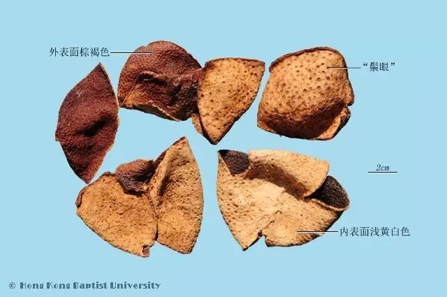 廣陳皮:常3瓣相連,形狀整齊,厚度均勻,約1mm。點(diǎn)狀油室較大,對(duì)光照視,透明清晰。質(zhì)較柔軟。