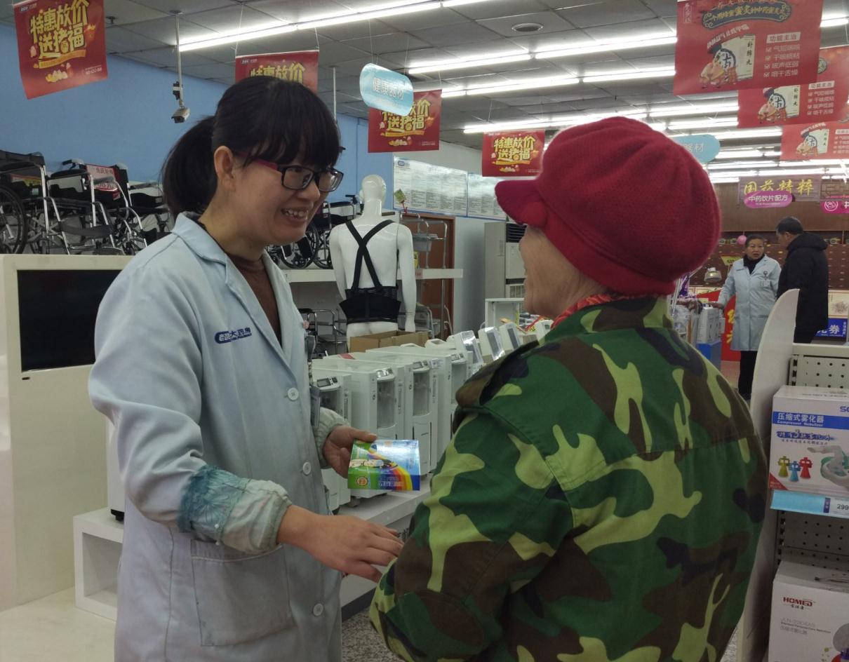 在店里,經(jīng)常能聽到陳同榮拉長音調(diào)、提高嗓門兒地說:“叔叔,這個(gè)哈,要一次——一片、一次——一片,一日——三次,您聽見了嗎?記得啊,吃這個(gè)藥,要多喝水,多喝水啊!”接著,又見她將用藥方法寫在藥盒顯著位置。