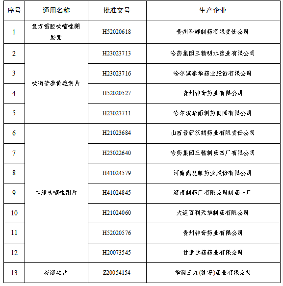 根據(jù)公告,目前我國(guó)已批準(zhǔn)上市的含呋喃唑酮復(fù)方制劑共有4個(gè)品種,分別是復(fù)方雪膽呋喃唑酮膠囊、呋喃苦參黃連素片、二維呋喃唑酮片、谷海生片。其中復(fù)方雪膽呋喃唑酮膠囊和谷海生片為獨(dú)家品種,分別由貴州科輝制藥有限責(zé)任公司、華潤(rùn)三九(雅安)藥業(yè)有限公司生產(chǎn)。呋喃苦參黃連素片的生產(chǎn)企業(yè)有哈藥集團(tuán)三精明水藥業(yè)有限公司、哈爾濱泰華藥業(yè)股份有限公司、貴州神奇藥業(yè)有限公司和哈爾濱華雨制藥集團(tuán)有限公司等4家。二維呋喃唑酮片的生產(chǎn)企業(yè)有山西晉新雙鶴藥業(yè)有限責(zé)任公司、哈藥集團(tuán)三精制藥四廠有限公司、河南鼎復(fù)康藥業(yè)股份有限公司、海南制藥廠有限公司制藥一廠、大連百利天華制藥有限公司、貴州神奇藥業(yè)有限公司、甘肅蘭藥藥業(yè)有限公司等7家。