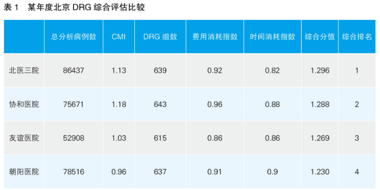 另外,DRG系統(tǒng)中的參數(shù)還可以用來(lái)橫向比較各個(gè)醫(yī)院的臨床治療綜合水平。如表1所示,北京協(xié)和醫(yī)院CMI和總DRG組數(shù)(即病例構(gòu)成的寬度)均在所有參比醫(yī)院中處于領(lǐng)先地位,但在綜合參考費(fèi)用和時(shí)間消耗因素上落后,綜合排名位列第二。DRG相關(guān)指標(biāo)能將以前難以量化的醫(yī)療服務(wù)質(zhì)量轉(zhuǎn)變?yōu)榭闪炕闹笜?biāo),使醫(yī)院和科室的雙橫向比較成為可能。而且醫(yī)院和科室之間科學(xué)量化的比較,能使優(yōu)勢(shì)醫(yī)院和科室更透明,這將促進(jìn)醫(yī)院科室之間對(duì)高新技術(shù)引進(jìn)和應(yīng)用的競(jìng)爭(zhēng)。