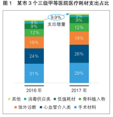 DRG的實(shí)施使藥品和醫(yī)療器械耗材從醫(yī)院的利潤(rùn)中心轉(zhuǎn)變?yōu)槌杀局行?,從收入?lái)源轉(zhuǎn)變?yōu)榭刭M(fèi)目標(biāo)。據(jù)相關(guān)研究表明,醫(yī)療耗材支出的增長(zhǎng)幅度高于醫(yī)院收入的增長(zhǎng),這將導(dǎo)致醫(yī)院對(duì)耗材的控費(fèi)更為緊迫。以圖1為例,可收費(fèi)的醫(yī)療耗材的支出,如心血管介入類等占比一直在增加,而不可收費(fèi)的醫(yī)療耗材,如部分手術(shù)材料、消毒供應(yīng)類耗材的采購(gòu)金額占比則呈明顯下降趨勢(shì)。