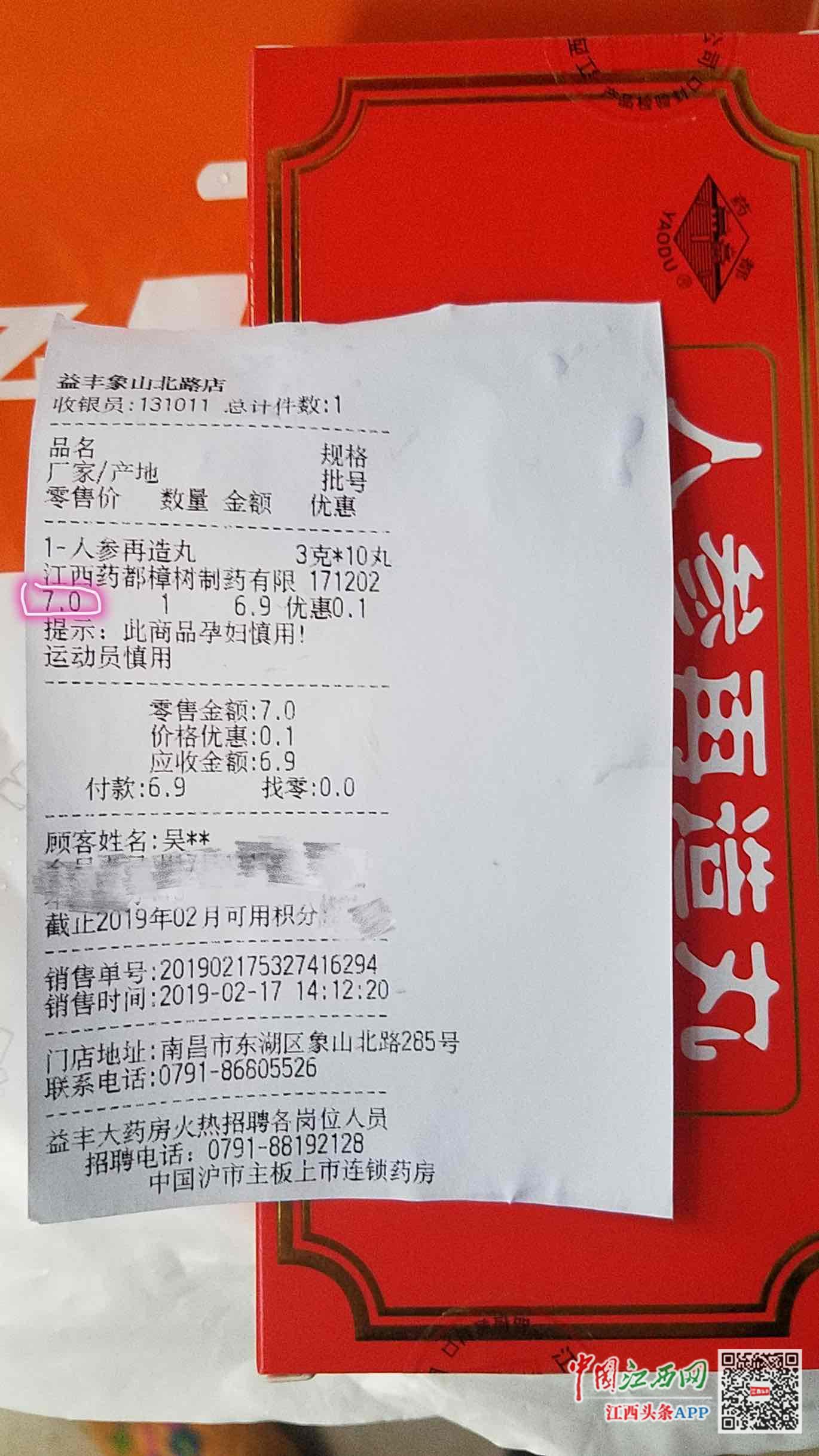 據(jù)吳先生介紹,2月17日下午,他在疊山路與象山北路口的黃慶仁棧華氏大藥房為家人購買處方藥“人參再造丸”,吳先生以一盒15.6元的價格購買了兩盒,之后在距離不到100米的益豐大藥房象山北路店購買同一生產(chǎn)廠家生產(chǎn)的同一種藥品時,僅以7元的單價就購買到了一盒。記者了解到,該藥由江西藥都樟樹制藥有限公司生產(chǎn),規(guī)格為一盒3g*10丸。