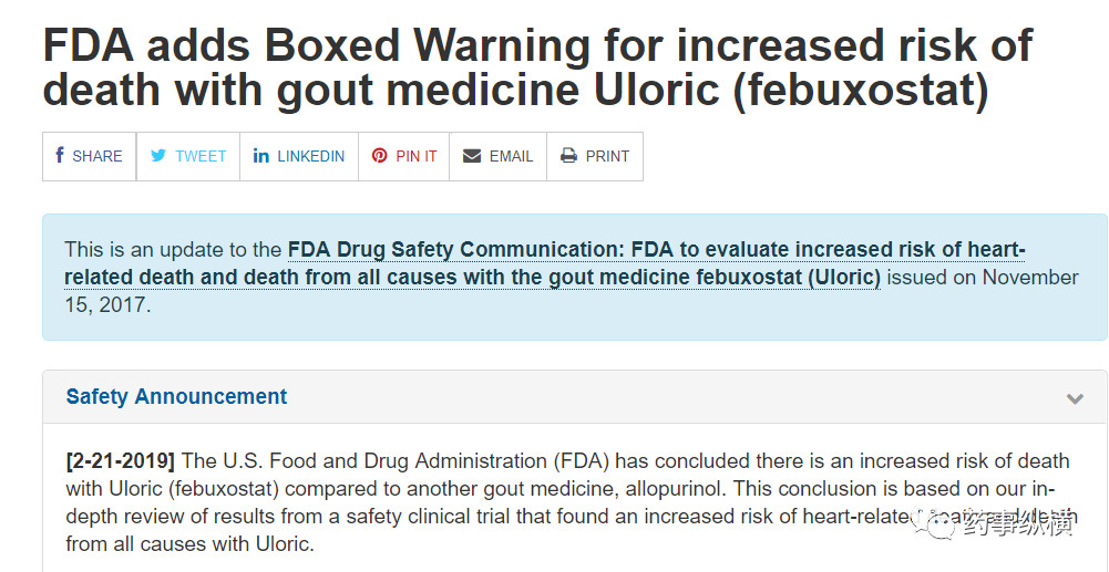 此黑框警告是對 2017年11月15號美國食品藥品監(jiān)督管理局所發(fā)布的關于抗痛風藥Uloric (非布司他片)心臟相關性死亡風險和全因死亡風險增高的藥物安全通訊的最新更新。