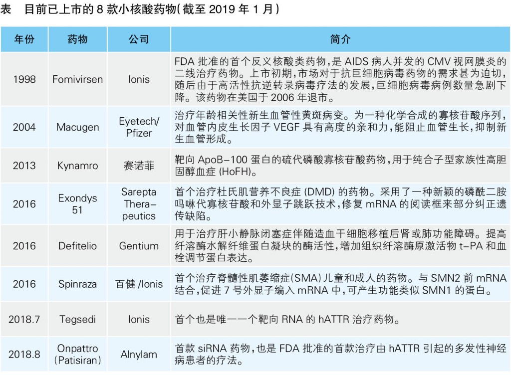 2017年11月,美國(guó)FDA認(rèn)定Alnylam制藥公司針對(duì)轉(zhuǎn)運(yùn)甲狀腺素蛋白的RNAi療法Patisiran為突破性療法;2018年8月,F(xiàn)DA批準(zhǔn)Patisiran輸注治療由遺傳性轉(zhuǎn)甲狀腺素蛋白淀粉樣變性(hATTR)引起的周?chē)窠?jīng)疾病患者。至此,Patisiran成為FDA批準(zhǔn)的首款小干擾RNA藥物。