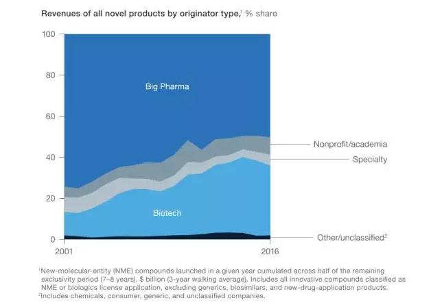 隨著生物技術(shù)公司的異軍突起,創(chuàng)新的來源逐漸從大藥企轉(zhuǎn)移到生物技術(shù)公司的實(shí)驗(yàn)室。據(jù)德勤報(bào)告,2018年12家頭部生物醫(yī)藥公司通過藥物研發(fā)創(chuàng)新獲得的回報(bào)僅為1.9%,而同期小型??扑幧锛夹g(shù)公司則達(dá)到9.3%。麥肯錫另一份統(tǒng)計(jì)報(bào)告也說明了近15年,研發(fā)源頭來自大藥企外部的創(chuàng)新產(chǎn)品年收入份額已經(jīng)從2001年的25%上升到2016年的50%,表明了生物技術(shù)公司的強(qiáng)大活力。