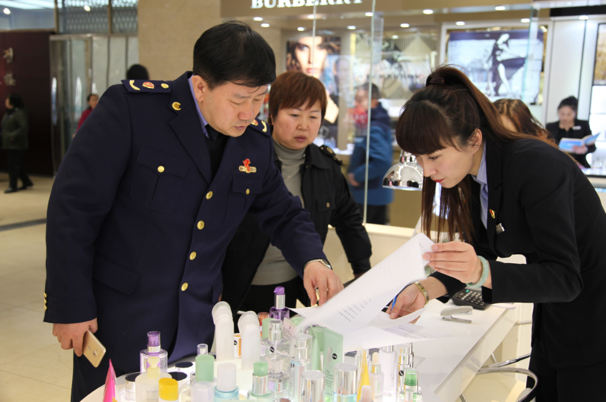 圖為執(zhí)法人員在延吉百貨大樓化妝品專(zhuān)柜進(jìn)行檢查