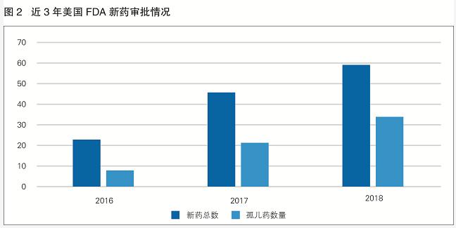 近年來,美國孤兒藥上市加速(見圖2)。2018年,美國FDA一共批準了59款新藥,打破了20年來的最高紀錄,其中有34款是作為孤兒藥獲批上市,占獲批新藥總數(shù)的57.63%。FDA首次批準了罕見遺傳學(xué)軟骨病、法布里病、苯丙酮尿癥的治療藥物。
