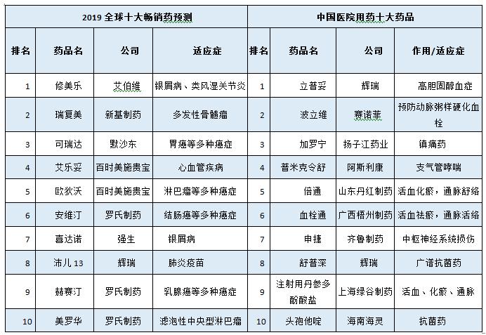 據(jù)預(yù)測(cè),全球十大暢銷藥共涉及七家藥企,其中,由艾伯維公司研發(fā)生產(chǎn)的修美樂(lè)(阿達(dá)木單抗)位居榜首,2019年預(yù)測(cè)銷售額達(dá)196.04億美元,近乎第二名抗腫瘤口服藥新基制藥的瑞復(fù)美銷售額的兩倍。與此同時(shí),羅氏制藥的安維汀、赫賽汀、美羅華三種藥物均上榜。