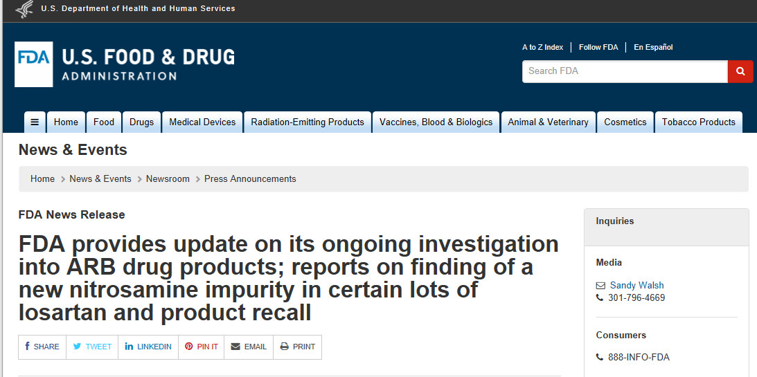 美國食品和藥物管理局FDA更新調(diào)查公告公告,該調(diào)查涉及最近對用于治療高血壓和心力衰竭的多種通用血管緊張素II受體阻滯劑(ARB)藥品的自愿召回。印度的Hetero Labs Ltd.宣布召回87批氯沙坦鉀片(25毫克,50毫克和100毫克)。由Hetero Labs制造并由Camber Pharmaceuticals分銷的召回的氯沙坦鉀片含有雜質(zhì)N-亞硝基-N-甲基-4-氨基丁酸(NMBA)。該雜質(zhì)是已知的動物和潛在的人類致癌物質(zhì)。這是由于存在NMBA而引起的第一次ARB召回,NMBA是ARB藥物中檢測到的第三種亞硝胺雜質(zhì)。