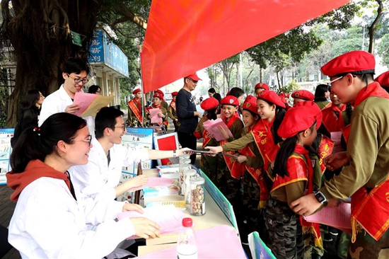 3月5日,廣西壯族自治區(qū)食品藥品檢驗(yàn)所參加廣西南寧桃源北社區(qū)組織的2019年“學(xué)雷鋒 行善立德 志愿服務(wù)滿綠城”活動,用實(shí)際行動傳遞雷鋒精神正能量。圖為廣西食藥檢所專業(yè)技術(shù)人員向小學(xué)生志愿者們講解真假中藥材鑒別、科學(xué)用藥等知識。(陳淑賢 攝)