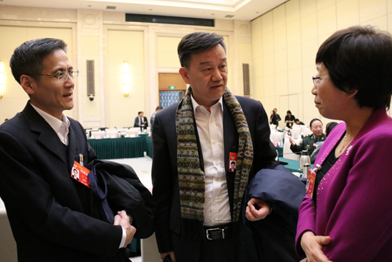 3月7日,全國(guó)政協(xié)十三屆二次會(huì)議醫(yī)藥衛(wèi)生界別聯(lián)組會(huì)議舉行。列席會(huì)議的國(guó)家藥監(jiān)局藥品注冊(cè)司司長(zhǎng)王平(左)、國(guó)家藥監(jiān)局藥品監(jiān)管司司長(zhǎng)袁林(中)在會(huì)議現(xiàn)場(chǎng)與全國(guó)政協(xié)委員、中國(guó)食品藥品檢定研究院標(biāo)準(zhǔn)物質(zhì)與標(biāo)準(zhǔn)化管理中心主任肖新月(右)交流。(中國(guó)食品藥品網(wǎng)記者陸悅 攝)