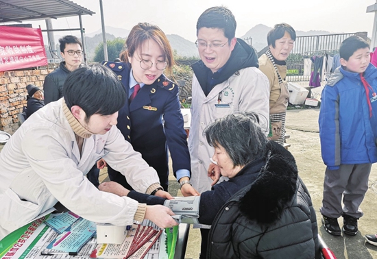 近日,浙江省寧波市定塘市場監(jiān)管所工作人員攜手定塘鎮(zhèn)中心衛(wèi)生院、象山縣藥學會的志愿者走進定塘鎮(zhèn)敬老院,為老人們免費測量血壓、血糖,普及安全用藥用械知識。(陳挺 攝)
