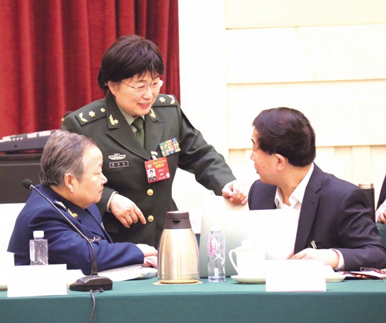 3月9日,在全國政協(xié)醫(yī)衛(wèi)界別小組會議間隙,全國政協(xié)委員、第四軍醫(yī)大學(xué)口腔醫(yī)學(xué)院教授趙銥民(左),全國政協(xié)委員、中國工程院院士韓雅玲(中),全國政協(xié)委員、北大口腔醫(yī)院教授林野(右)在討論業(yè)內(nèi)關(guān)注的熱點(diǎn)話題。(《中國醫(yī)藥報(bào)》記者陸悅 攝)