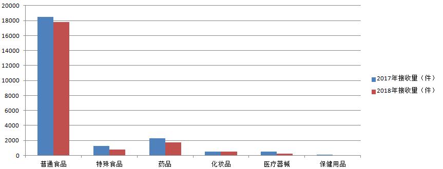 投訴舉報(bào)信息從地區(qū)分布情況來看,接收最多的地區(qū)是西安市(9364件),占投訴舉報(bào)信息總量的44.2%;其次為陜西省藥監(jiān)局投訴舉報(bào)大廳(3324件),占總量的15.7%。從產(chǎn)品種類來看,普通食品17798件,占84.1%;藥品、特殊食品、化妝品、醫(yī)療器械、保健用品,分別占8.3%、3.7%、2.4%、1.3%、0.3%。與2017年相比,除化妝品外,其余的普通食品、特殊食品、保健用品、藥品和醫(yī)療器械投訴舉報(bào)信息總量均有所下降。