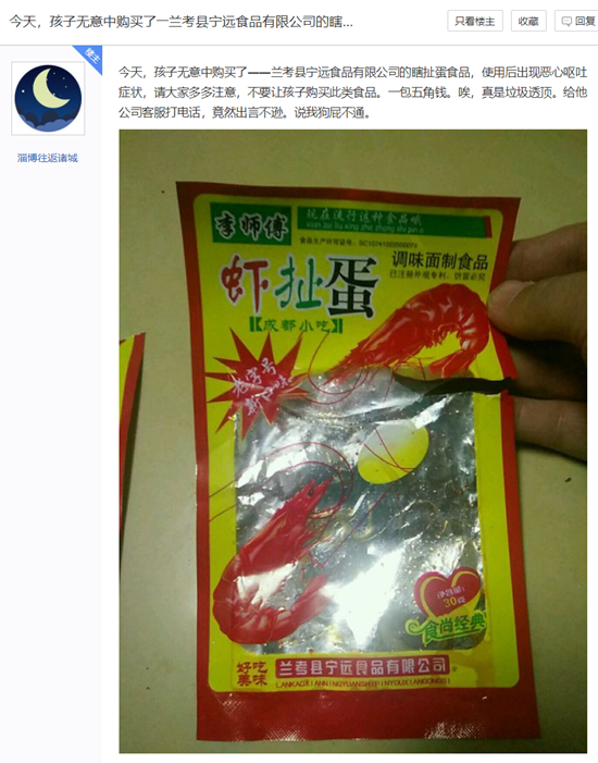 在晚會(huì)上,特別提及了辣條的品牌為“蝦扯蛋辣條”。目前淘寶和京東都搜索不到“蝦扯蛋辣條”。記者在網(wǎng)上搜索了有關(guān)“蝦扯蛋辣條”的信息,發(fā)現(xiàn)在2018年初就有網(wǎng)民在網(wǎng)上曝光“蝦扯蛋辣條”,稱孩子購(gòu)買(mǎi)食用后出現(xiàn)惡心、嘔吐等癥狀。
