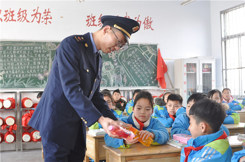 圖為東海縣市場(chǎng)監(jiān)督管理局執(zhí)法人員在黃川鎮(zhèn)中心小學(xué)為學(xué)生講解如何辨別假冒偽劣食品。通訊員 張正友 攝