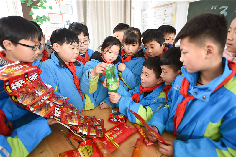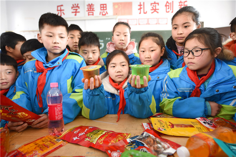 圖為東海縣黃川鎮(zhèn)中心小學(xué)學(xué)生正在識(shí)別“三無(wú)”食品。通訊員 張正友 攝