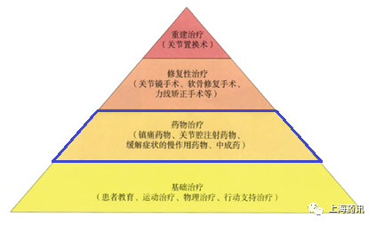 基礎(chǔ)治療適用于所有OA患者;早期患者,依據(jù)患者的需求和一般情況,可選擇適宜的基礎(chǔ)治療方案;病情加重,進(jìn)入第二層藥物治療,在考慮患者發(fā)病的部位及自身危險(xiǎn)因素的基礎(chǔ)上,選擇正確的用藥途徑及藥物種類;病情進(jìn)一步加重。在基礎(chǔ)治療和藥物治療無(wú)效的前提下進(jìn)行手術(shù)治療,手術(shù)方案需依據(jù)患者病變部位、病變程度、一般情況以及自身意愿綜合考慮。