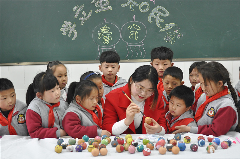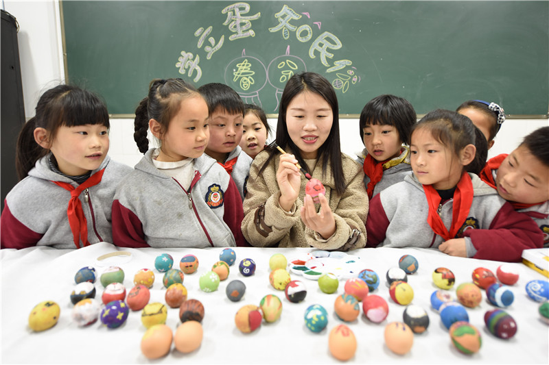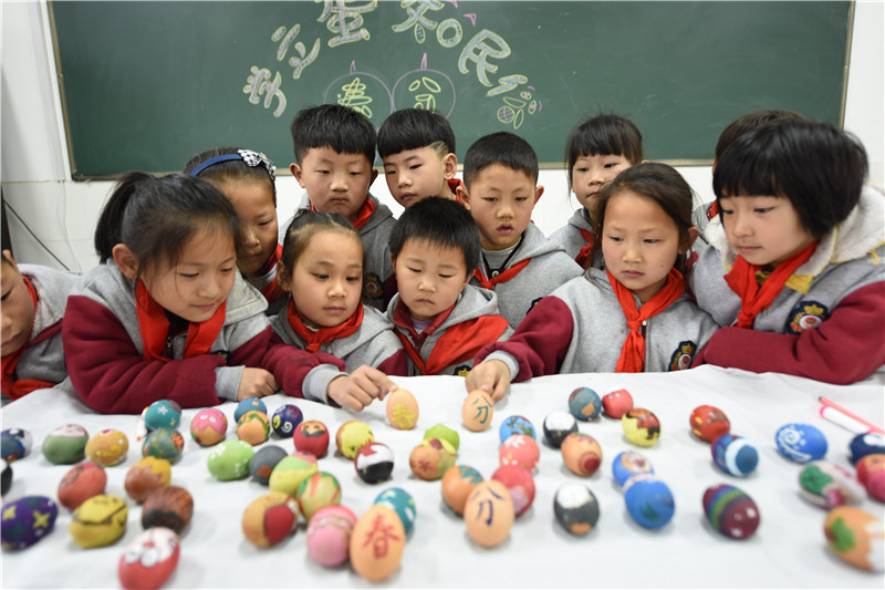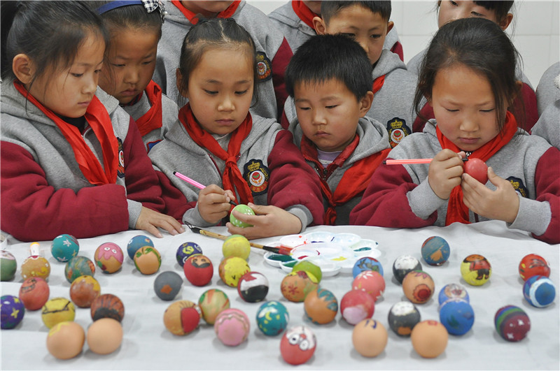 圖為東??h桃林鎮(zhèn)第二中心小學(xué)學(xué)生正在繪畫(huà)“彩蛋”。張玲 攝