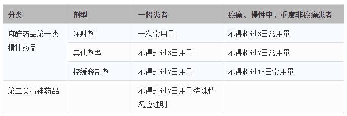 為門(mén)(急)診癌癥疼痛患者和中、重度慢性疼痛患者開(kāi)具的麻醉藥品、第一類(lèi)精神藥品注射劑,每張?zhí)幏讲坏贸^(guò)3日常用量;控緩釋制劑,每張?zhí)幏讲坏贸^(guò)15日常用量;其他劑型,每張?zhí)幏讲坏贸^(guò)7日常用量。