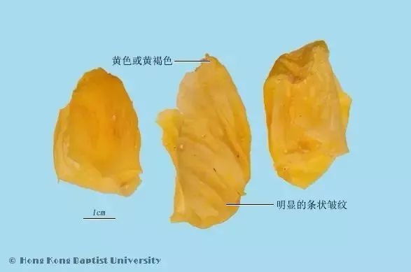 性狀鑒別:本品為不規(guī)則卷片,厚約2mm。表面黃色、黃綠色或黃褐色,薄而半透明,具明顯的條狀皺紋。質(zhì)脆,易碎,斷面角質(zhì)樣,有光澤。氣微腥,味微苦。