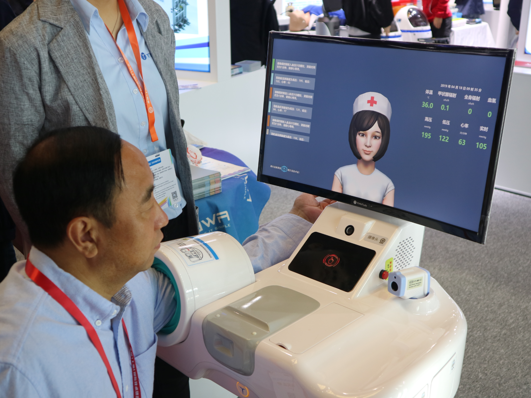 在高校展區(qū)旁邊,上海鈦米機(jī)器人科技有限公司的一臺(tái)核醫(yī)學(xué)科醫(yī)療服務(wù)機(jī)器人正在為一位老人測(cè)量血壓。據(jù)工作人員介紹,核醫(yī)學(xué)科醫(yī)療服務(wù)機(jī)器人以移動(dòng)機(jī)器人為載體,在機(jī)身上搭載血壓計(jì)、體溫計(jì)、蓋格計(jì)數(shù)器等多款醫(yī)療設(shè)備,可以代替醫(yī)護(hù)人員對(duì)患者進(jìn)行日常的體征檢測(cè)、醫(yī)學(xué)知識(shí)宣教、藥物配送、室內(nèi)放射值測(cè)量等工作,同時(shí)還支持患者與醫(yī)生護(hù)士的遠(yuǎn)程視頻?!皺C(jī)器人能夠代替醫(yī)護(hù)人員進(jìn)入輻射隔離區(qū),執(zhí)行病人生命體征測(cè)量,在保護(hù)醫(yī)護(hù)人員安全的同時(shí),可最大程度進(jìn)行患者的精細(xì)化管理?!?/p>