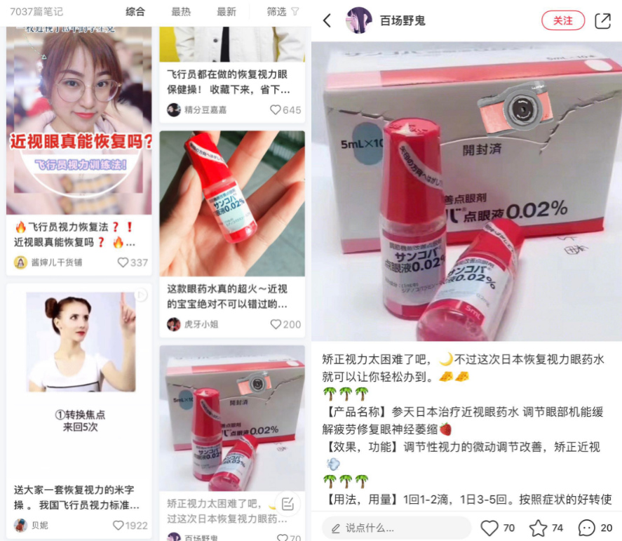 在小紅書平臺,以“恢復視力”為關(guān)鍵詞進行搜索,結(jié)果顯示有7037篇筆記,亦有部分分享者聲稱使用“日本參天調(diào)解眼機能眼藥水”可以恢復視力。