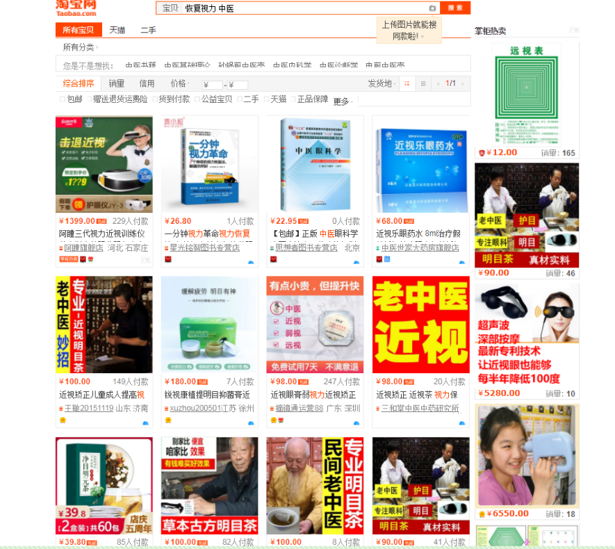 圖為淘寶搜索“中醫(yī)近視”“恢復近視 中醫(yī)”等關(guān)鍵詞的搜索結(jié)果。