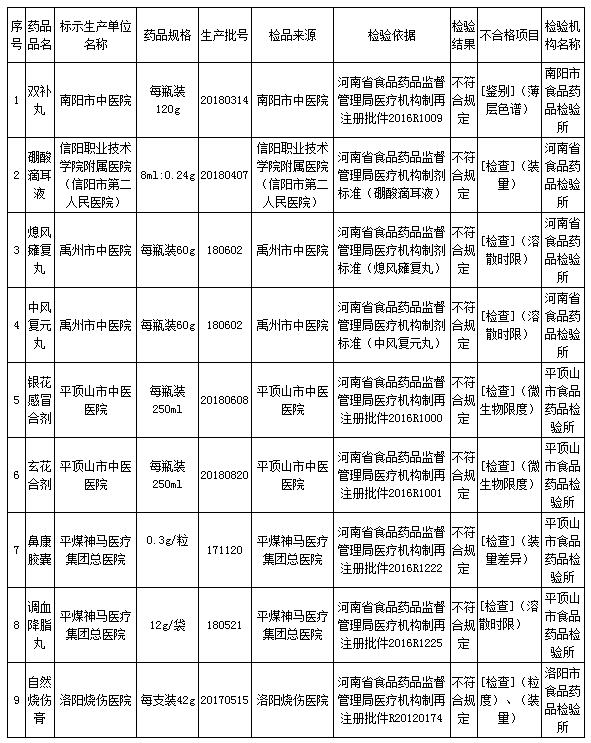 一、經(jīng)南陽(yáng)市食品藥品檢驗(yàn)所檢驗(yàn),標(biāo)示為南陽(yáng)市中醫(yī)院配制的雙補(bǔ)丸(批號(hào)20180314)不合格,不合格項(xiàng)目為薄層色譜。經(jīng)河南省食品藥品檢驗(yàn)所檢驗(yàn),標(biāo)示為信陽(yáng)職業(yè)技術(shù)學(xué)院附屬醫(yī)院(信陽(yáng)市第二人民醫(yī)院)配制的硼酸滴耳液(批號(hào)20180407)不合格,不合格項(xiàng)目為裝量;標(biāo)示為禹州市中醫(yī)院配制的熄風(fēng)癱復(fù)丸(批號(hào)180602)、中風(fēng)復(fù)元丸(批號(hào)180602)不合格,不合格項(xiàng)目均為溶散時(shí)限。經(jīng)平頂山市食品藥品檢驗(yàn)所檢驗(yàn),標(biāo)示為平頂山市中醫(yī)醫(yī)院配制的銀花感冒合劑(批號(hào)20180608)、玄花合劑(批號(hào)20180820)不合格,不合格項(xiàng)目均為微生物限度;標(biāo)示為平煤神馬醫(yī)療集團(tuán)總醫(yī)院配制的鼻康膠囊(批號(hào)171120)、調(diào)血降脂丸(批號(hào)180521)不合格,不合格項(xiàng)目為裝量差異、溶散時(shí)限。經(jīng)洛陽(yáng)市食品藥品檢驗(yàn)所檢驗(yàn),標(biāo)示為洛陽(yáng)燒傷醫(yī)院配制的自然燒傷膏(批號(hào)20170515)不合格,不合格項(xiàng)目為粒度、裝量。