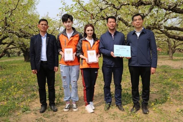 演員陳星旭、彭小苒與碭山縣副縣長朱明春(右一)、副縣長薛勇(右二)在碭山梨園。