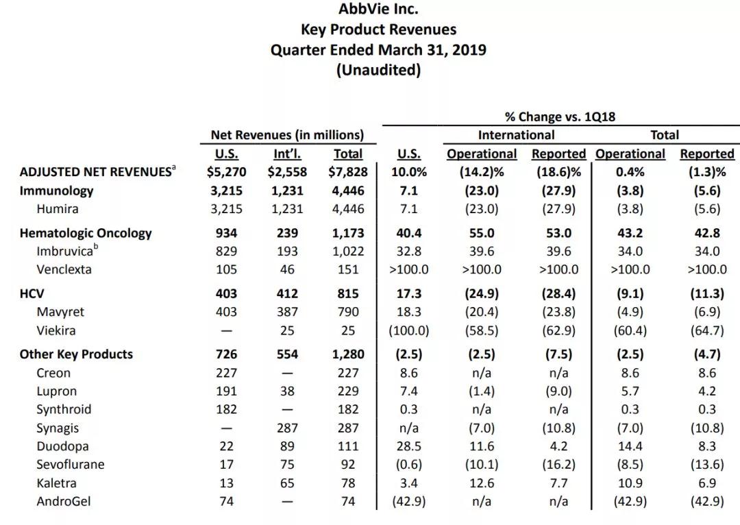 2019年4月25日,艾伯維(AbbVie)披露2019年Q1季報: